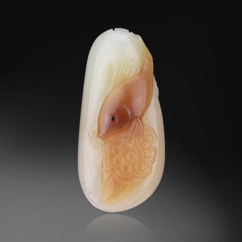 作品構思巧妙,鯉魚躍然而起于荷花之間,喜慶之意呼之欲出。“魚”與“余”諧音,自古是深受人們喜愛的喜慶造型,象征吉慶有余、連年有余。且玉質上佳,工亦良工,遠觀近看寶氣盈盈。盤之玩之,難以釋手。
