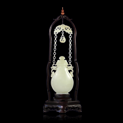 寶瓶玉質縝密溫潤,水色晶瑩,且勻度、凈度極佳,為上等玉料。瓶身光素無紋,瓶腹渾圓飽滿,兩只瓶耳上以無數活環相連系于一玉片作為提梁,與寶瓶成為一體,完美無缺,瓶肩以如意為耳,各置一活環。