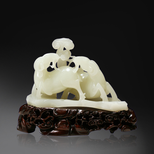 編號:Q1009-143 白玉質,玉質上佳,無雜質,瑩潤如凝脂。圓雕兩只羊和大如意,寓意吉祥如意。造型簡潔明快,刀工精湛,打磨潤澤,更因其質地潔白無瑕,使羊之溫順的性情與肥美的體態得以極好的展現。 作品配以紅木底座,更顯高貴大方。是陶冶情趣,收藏把玩的精品之作。