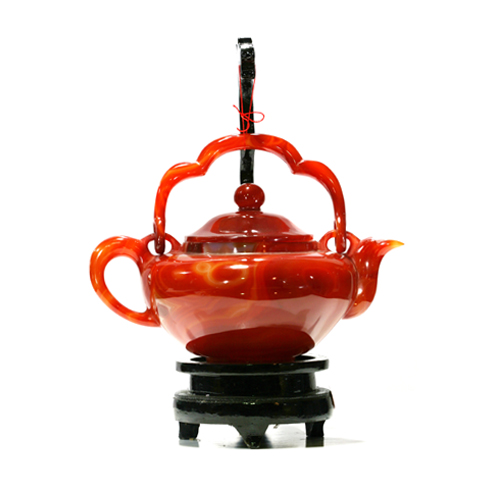 編號:0Q1012-013 此款天然瑪瑙精制茶壺,設計莊重大氣,拋光均勻,打磨光滑,紅色光亮迷人,優雅別致的瑪瑙提梁壺,配上精美的紅木龍頭底座,龍喜水,與茶壺相映成趣,很是完美,既是一款精美的藝術品,極具欣賞性,又美觀實用。