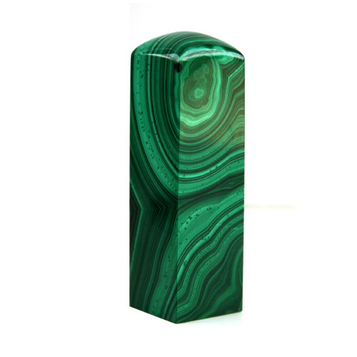 打磨成的印章,自然清新,味意雋永,間或柳葉彎眉,又似清晨露滴。氣質(zhì)獨(dú)特,高貴典雅,為印章藝術(shù)的奇葩;天生麗質(zhì),精美絕倫,色彩艷麗,紋理細(xì)膩,屬孔雀石上品,可謂“印章皇后”。孔雀石的英文名稱為Malachite,來自希臘語Mallache,指一種叫錦葵(Mallows)的植物,意思是“綠色”,以象征孔雀石的顏色。孔雀石由于顏色酷似孔雀羽毛上綠色的斑點(diǎn)而獲得如此美麗的名字。