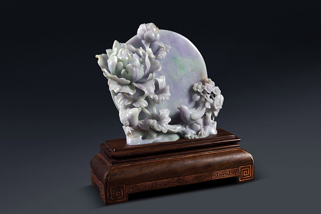 采用立雕形式構(gòu)思設(shè)計(jì),主體以象征富貴的牡丹、象征好運(yùn)的喜鵲及象征圓滿的圓月構(gòu)成?;ㄩ_富貴牡丹,喜兆吉祥喜鵲,幸福美滿圓月共同寄托了“愿花長(zhǎng)好,人長(zhǎng)健,月長(zhǎng)圓”的良好祝愿。高檔紫色玉面,帶點(diǎn)俏色,實(shí)為罕見,細(xì)膩縝密,質(zhì)感柔潤(rùn),刀法簡(jiǎn)潔而傳神,為翡翠中不可多得之上品。