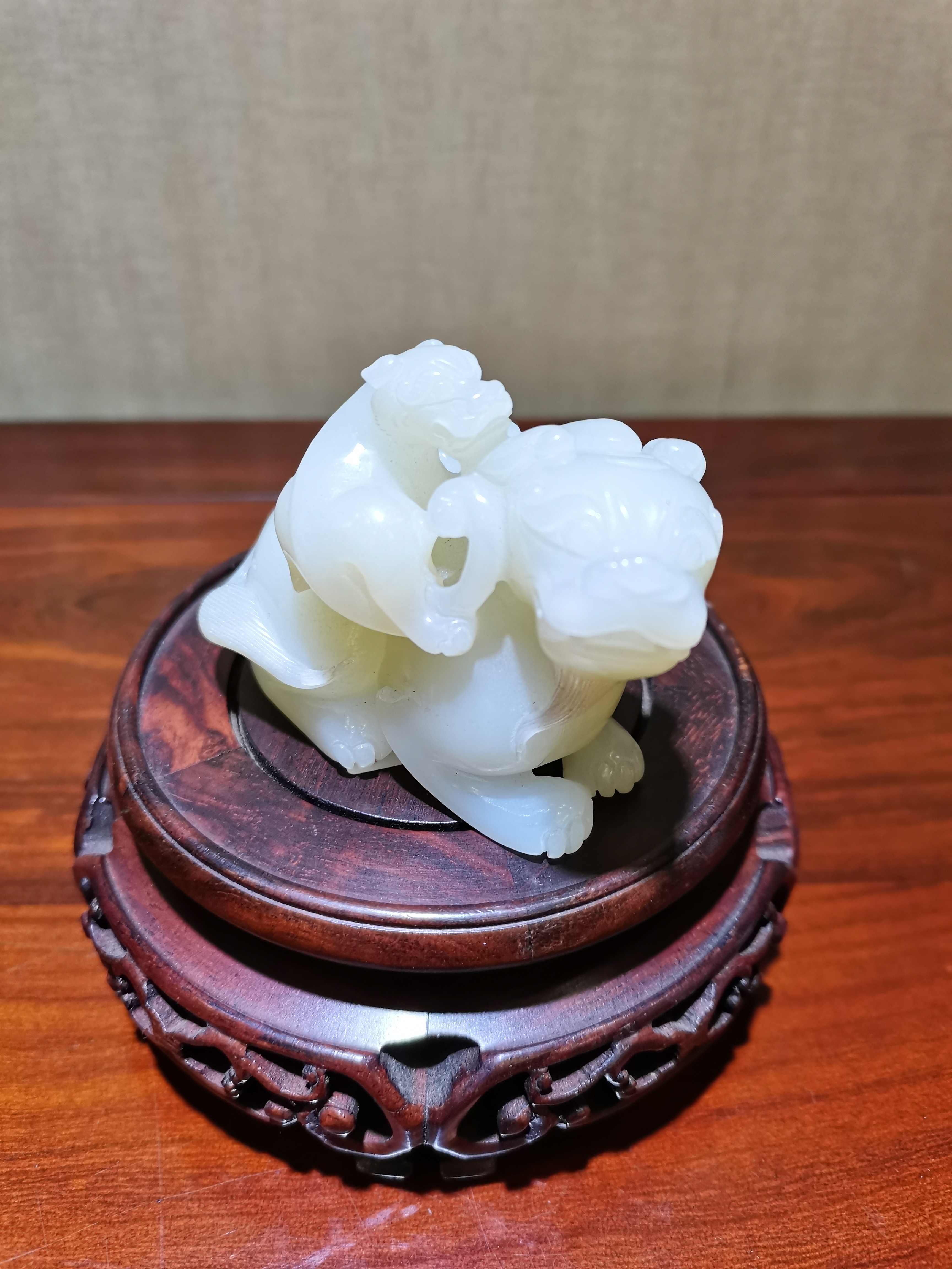 此款和田玉把件雕刻的母子貔貅,線條流暢,威武霸氣,雙雙凝視前方,伺機(jī)而動。子貔貅站在母貔貅身上,代表招財更上一層樓。故得名:攜子上朝