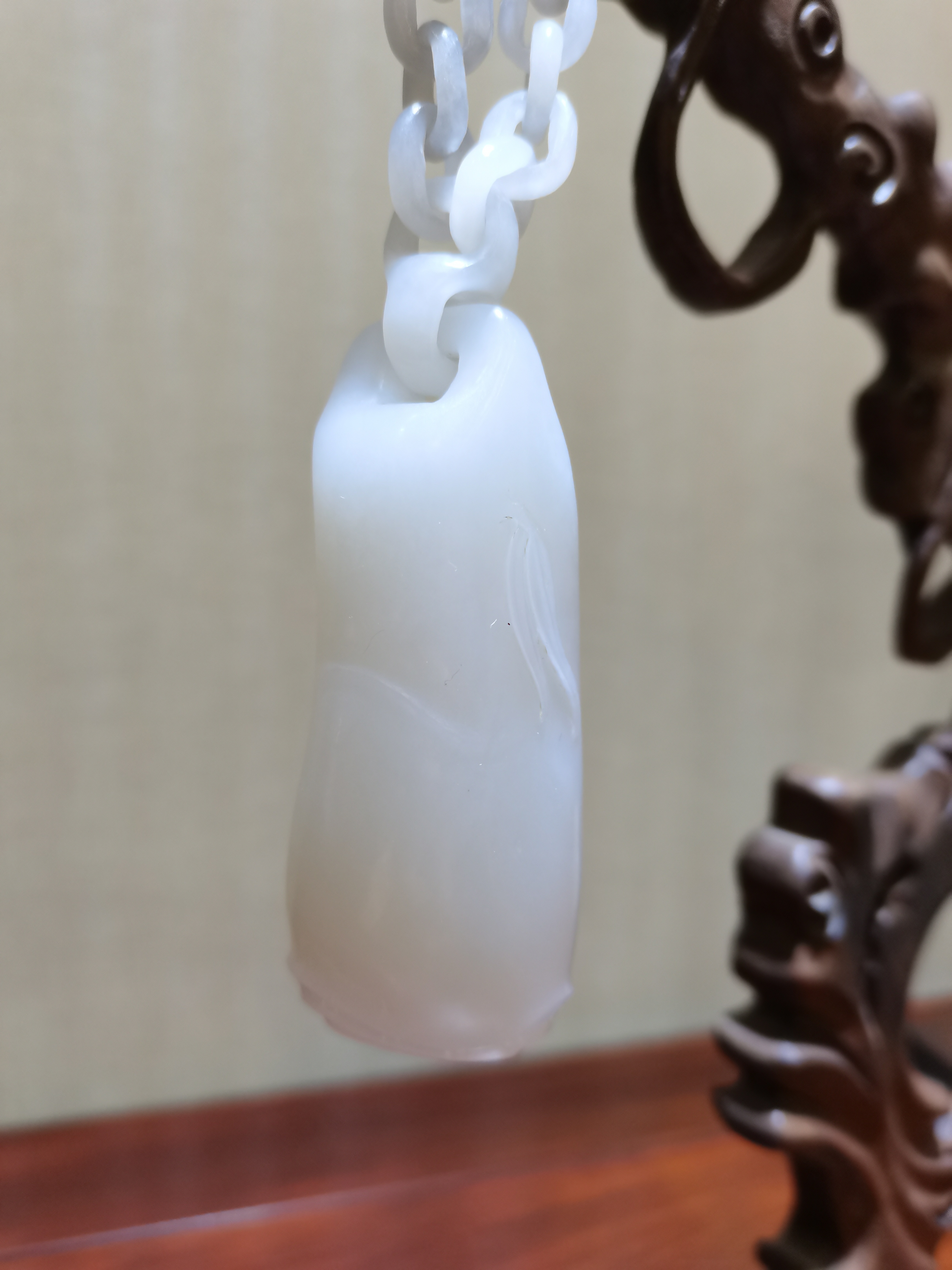 玉質(zhì)溫潤,掛件部分玉色凝白、油脂性強(qiáng),鏈條部分煙青色、質(zhì)感細(xì)膩。加上堪稱雕刻絕技的,鏤空鏈條,使整件作品價值倍增、十分難得,堪稱賞、玩、藏、傳世之極品。