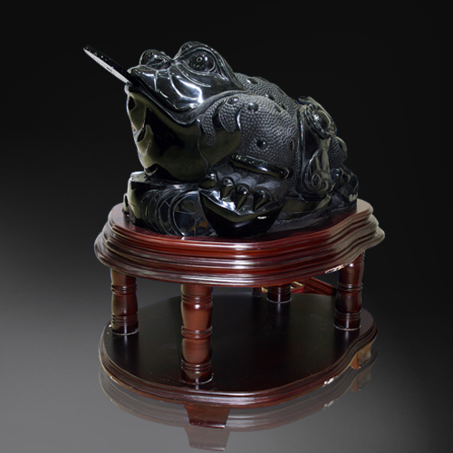 融入圓雕,浮雕手法精心雕琢的瑞獸三足金蟾,工藝細膩,造型豐滿,生動逼真。傳說金蟾為靈物瑞獸,是對主人有利的招財飾物,能催旺財氣。人們相信蟾能辟兇邪,鎮(zhèn)宅,助長壽,是主富貴的首選吉祥之物,故有“得金蟾者必大富大貴”之說。三足金蟾壽命很長,傳說可以活到三千歲,得之者無不大富,金錢纏身。故金蟾代表“祿”。