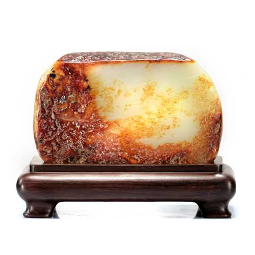 玉質細膩縝密,油潤細濡,整器厚重,敦厚優(yōu)美,全身覆艷麗皮色乃棗紅與濃淡不一的黃色相間,醒目喜慶,色澤誘人。其尺寸大小適正,展、供、仰、賞俱佳。